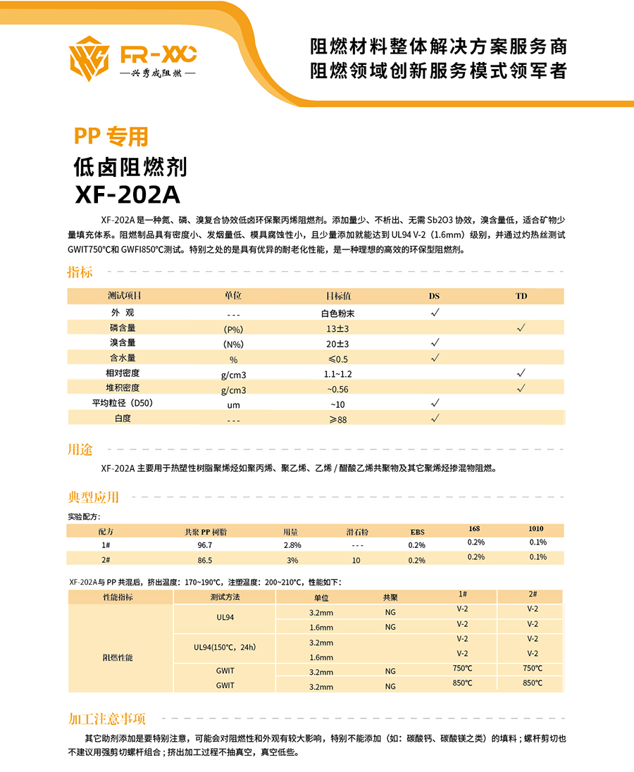 XF-202A/C 是一种氮、磷、溴复合协效低卤环保聚丙烯阻燃剂。添加量少、 不析出、无需 Sb2O3 协效,溴含量低,适合矿物少量填充体系。阻燃制品具有密度 小、发烟量低、模具腐蚀性小,且少量添加就能达到 UL94 V-2(1.6mm)级别,并 通过灼热丝测试 GWIT-750℃和 GWFI-850℃测试。特别之处的是具有优异的耐 老化性能,是一种理想的高效的环保型阻燃剂。