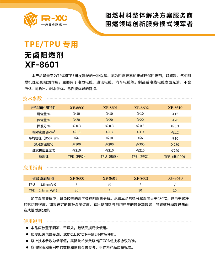 本产品是是专为TPU和TPE研发复配的一种以磷、氮为阻燃元素的无卤环保阻燃剂,以成炭、气相阻燃机理起到阻燃作用。主要用于电力电缆、通讯电缆、汽车电缆等。制品或电线电缆表面光滑、不含 PH3、耐析出、耐水性优、电性能优异的特点。