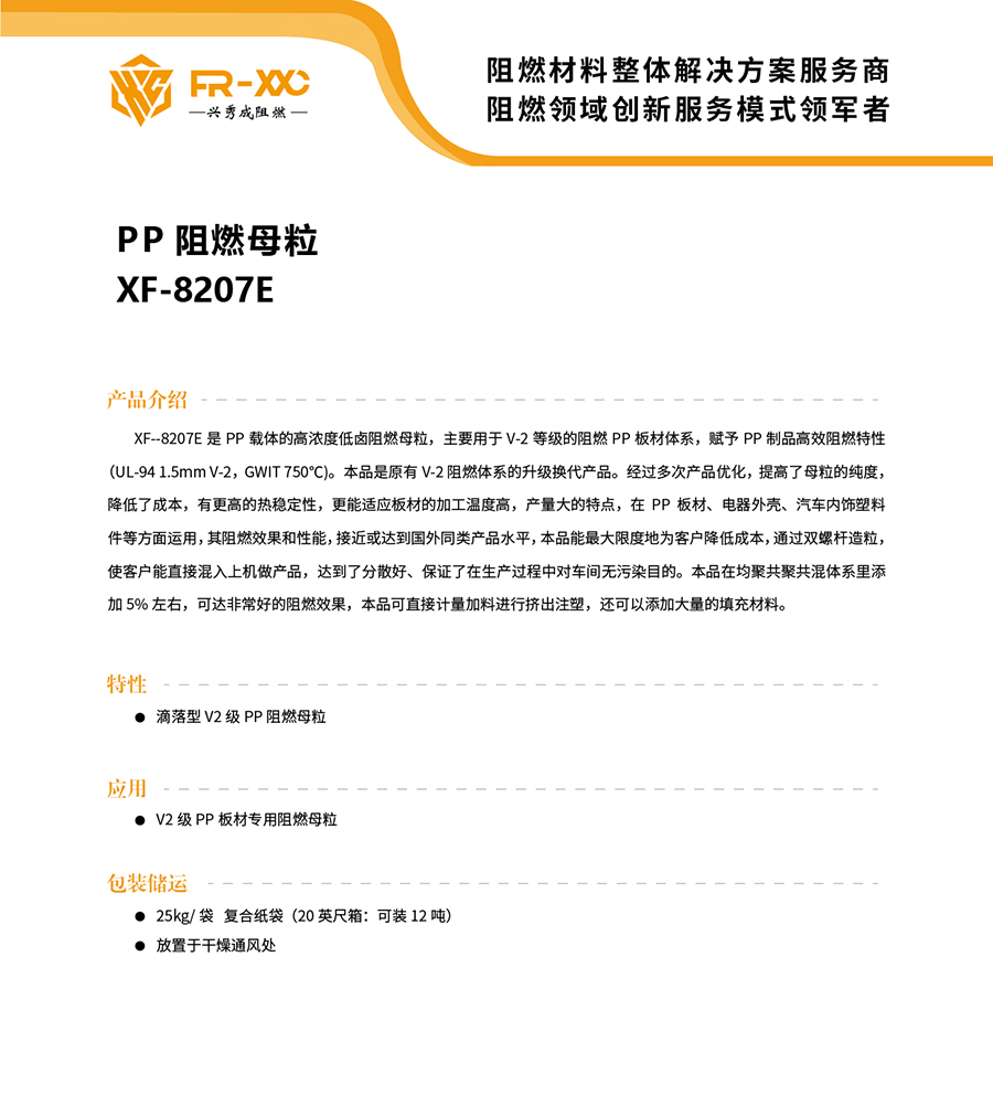 XF--8207E是PP载体的高浓度低卤阻燃母粒,主要用于V-2等级的阻燃PP板材体系,赋予PP制品高效阻燃特性(UL-94 1.5mm V-2,GWIT 750C)。本品是原有V-2阻燃体系的升级换代产品。经过多次产品优化,提高了母粒的纯度, 降低了成本,有更高的热稳定性,更能适应板材的加工温度高,产量大的特点,在PP 板材、电器外壳、汽车内饰塑料 件等方面运用,其阻燃效果和性能,接近或达到国外同类产品水平,本品能最大限度地为客户降低成本,通过双螺杆造粒, 使客户能直接混入上机做产品,达到了分散好、保证了在生产过程中对车间无污染目的。本品在均聚共聚共混体系里添加5%左右,可达非常好的阻燃效果,本品可直接计量加料进行挤出注塑,还可以添加大量的填充材料。