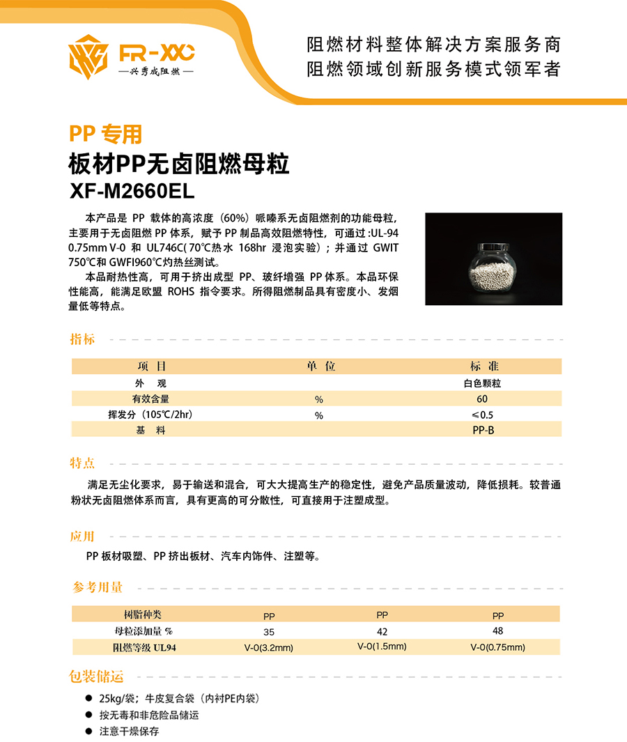 本产品是 PP 载体的高浓度(60%)哌嗪系无卤阻燃剂的功能母粒,主要用于无卤阻燃PP体系,赋予PP制品高效阻燃特性,可通过:UL-94 0.75mmV-0和UL746C(70℃热水168hr浸泡实验);并通过GWIT750℃和 GWFI960C灼热丝测试。 本品耐热性高,可用于挤出成型PP、玻纤增强PP体系。本品环保性能高,能满足欧盟ROHS 指令要求。所得阻燃制品具有密度小、发烟量低等特点。