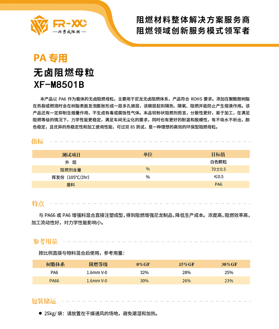 本产品以 PA6作为载体的无卤阻燃母粒,主要用于尼龙无卤阻燃体系,产品符合ROHS 要求。添加在聚酰胺树脂在热裂或燃烧时会在树脂表面发泡膨胀形成一层多孔碳层,该碳层起到隔热、隔氧、阻燃并能防止产生熔滴作用。该产品还有一定抑制生烟量作用,不生成有毒或腐蚀性气体。本品较粉状阻燃剂而言,分散性更好,易于加工,在满足阻燃等级的情况下,力学性能更稳定,满足车间无尘化的需求,同时也有更好的耐温和脱模性,有不吸水不析出,颜色稳定,且优异的热稳定性和加工使用性能,可过双85测试,是一种理想的高效的环保型阻燃母粒。