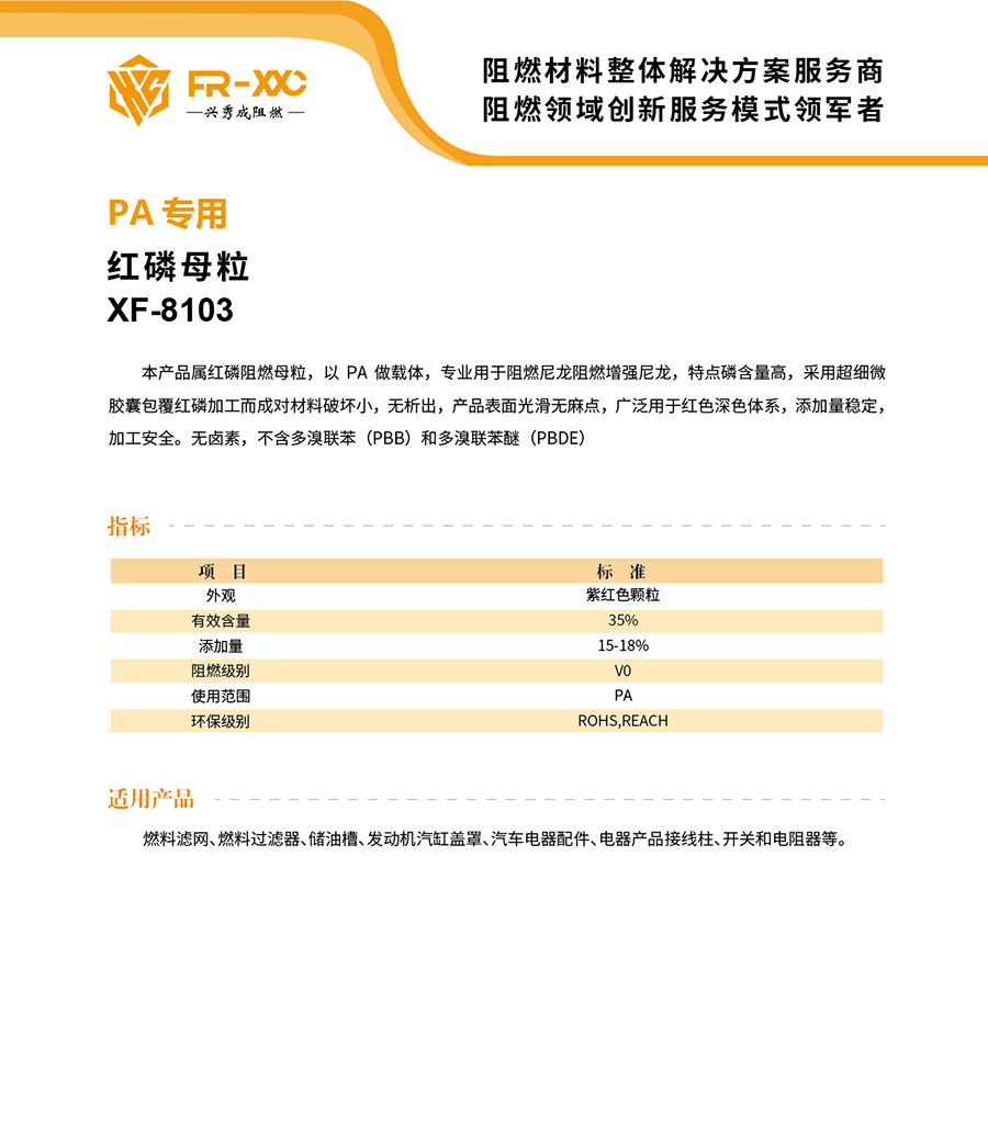 本产品属红磷阻燃母粒,以PA 做载体,专业用于阻燃尼龙阻燃增强尼龙,特点磷含量高,采用超细微胶囊包覆红磷加工而成对材料破坏小,无析出,产品表面光滑无麻点,广泛用于红色深色体系,添加量稳定,加工安全。无卤素,不含多溴联苯(PBB)和多溴联苯醚(PBDE)