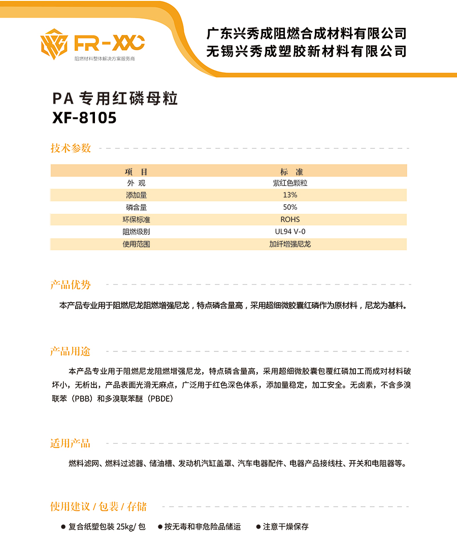 本产品专业用于阻燃尼龙阻燃增强尼龙,特点磷含量高,采用超细微胶囊包覆红磷加工而成对材料破坏小,无析出,产品表面光滑无麻点,广泛用于红色深色体系,添加量稳定,加工安全。无卤素,不含多溴联苯 (PBB)和多溴联苯醚(PBDE)