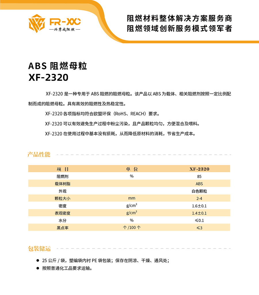 XF-2320是一种专用于ABS阻燃的阻燃母粒。该产品以ABS为载体、相关阻燃剂按照一定比例配制而成的阻燃母粒。具有高效的阻燃性及热稳定性。 XF-2320各项指标均符合欧盟环保(RoHS、REACH)要求。 XF-2320可以有效避免生产过程中粉尘污染,且产品颗粒均匀,方便混合及喂料。 XF-2320在使用过程中基本没有损耗,从而降低原材料的消耗,节省生产成本。