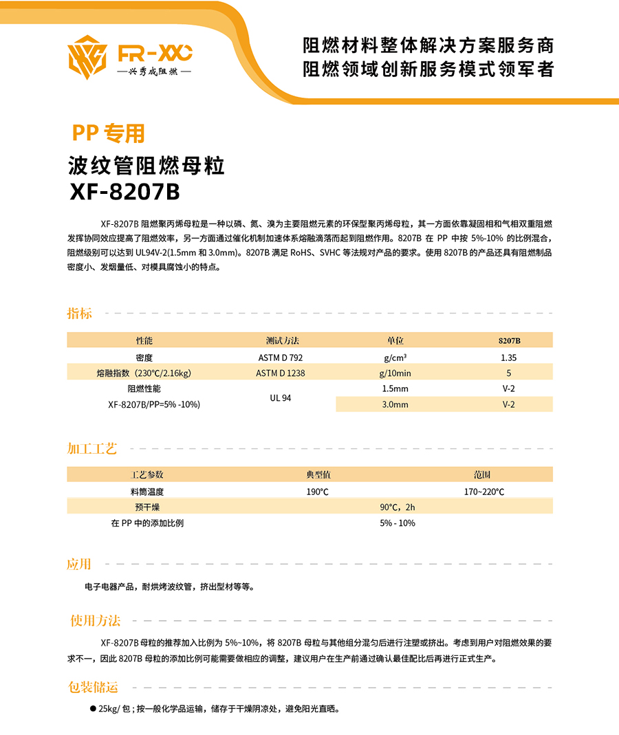 XF-8207B阻燃聚丙烯母粒是一种以磷、氮、溴为主要阻燃元素的环保型聚丙烯母粒,其一方面依靠凝固相和气相双重阻燃发挥协同效应提高了阻燃效率,另一方面通过催化机制加速体系熔融滴落而起到阻燃作用。8207B在PP中按5%-10% 的比例混合,阻燃级别可以达到UL94V-2(1.5mm和3.0mm)。8207B满足RoHS、SVHC等法规对产品的要求。使用8207B的产品还具有阻燃制品密度小、发烟量低、对模具腐蚀小的特点。