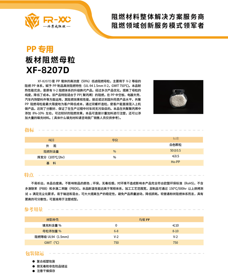XF-8207D是PP 载体的高浓度(50%)低卤阻燃母粒,主要用于V-2等级的 阻燃PP 体系,赋予PP制品高效阻燃特性(UL-94 1.5mm V-2,GWIT 750℃)。本品耐热性能优良,是原有V-2阻燃体系的升级换代产品。经过多次产品优化,提高了母粒的纯度,降低了成本。该产品特别适合于PP(聚丙烯)的阻燃,在PP中空板、电器外壳、汽车内饰塑料件等方面运用,其阻燃效果和性能,接近或达到国外同类产品水平,共聚 PP 阻燃母粒能最大限度地为客户降低成本,通过双螺杆造粒,使客户能直接混入上机做产品,达到了分散好、保证了在生产过程中对车间无污染目的。本品在共聚聚丙烯中添加8%-10%左右,可达较好的阻燃效果,本品可直接计量加料进行注塑,还可以添加大量的填充材料。(具体什么填充材料请咨询我厂销售人员仅供参考)。
