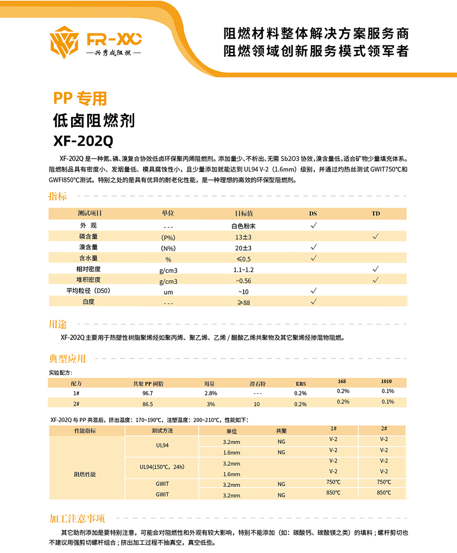 XF-202Q是一种氮、磷、溴复合协效低卤环保聚丙烯阻燃剂。添加量少、不析出、无需Sb203协效,溴含量低,适合矿物少量填充体系。阻燃制品具有密度小、发烟量低、模具腐蚀性小,且少量添加就能达到UL94V-2(1.6mm)级别,并通过灼热丝测试GWIT750C和 GWFI850℃测试。特别之处的是具有优异的耐老化性能,是一种理想的高效的环保型阻燃剂。