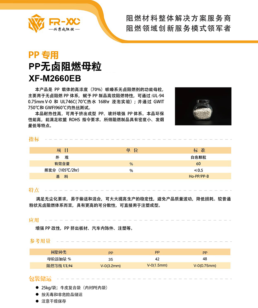 本产品是 PP 载体的高浓度(70%)哌嗪系无卤阻燃剂的功能母粒,主要用于无卤阻燃PP体系,赋予PP制品高效阻燃特性,可通过:UL-94 0.75mmV-0和UL746C(70℃热水168hr浸泡实验);并通过GWIT750℃和 GWFI960C灼热丝测试。 本品耐热性高,可用于挤出成型PP、玻纤增强PP体系。本品环保性能高,能满足欧盟ROHS 指令要求。所得阻燃制品具有密度小、发烟量低等特点。