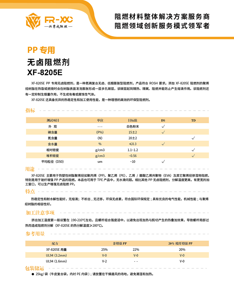 XF-8205E 是 PP 专用无卤阻燃剂,是一种氮磷复合无卤、低烟膨胀型阻燃 剂,产品符合 ROSH 要求。添加 XF-8205A 阻燃剂的聚烯烃树脂在热裂或燃烧时 会在树脂表面发泡膨胀形成一层多孔碳层,该碳层起到隔热、隔氧、阻燃并能防止 产生熔滴作用。该阻燃剂还有一定抑制生烟量作用,不生成有毒或腐蚀性气体。相 比 XF-8205A,它的分解温度更高,热稳定性更优异,更易加工,是一种理想的高 效的环保型阻燃剂。
