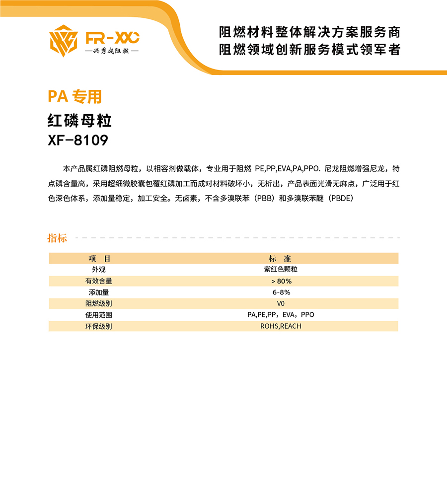 本产品属红磷阻燃母粒,以相容剂做载体,专业用于阻燃PE,PP,EVA,PA,PPO.尼龙阻燃增强尼龙,特点磷含量高,采用超细微胶囊包覆红磷加工而成对材料破坏小,无析出,产品表面光滑无麻点,广泛用于红色深色体系,添加量稳定,加工安全。无卤素,不含多溴联苯(PBB)和多溴联苯醚(PBDE)