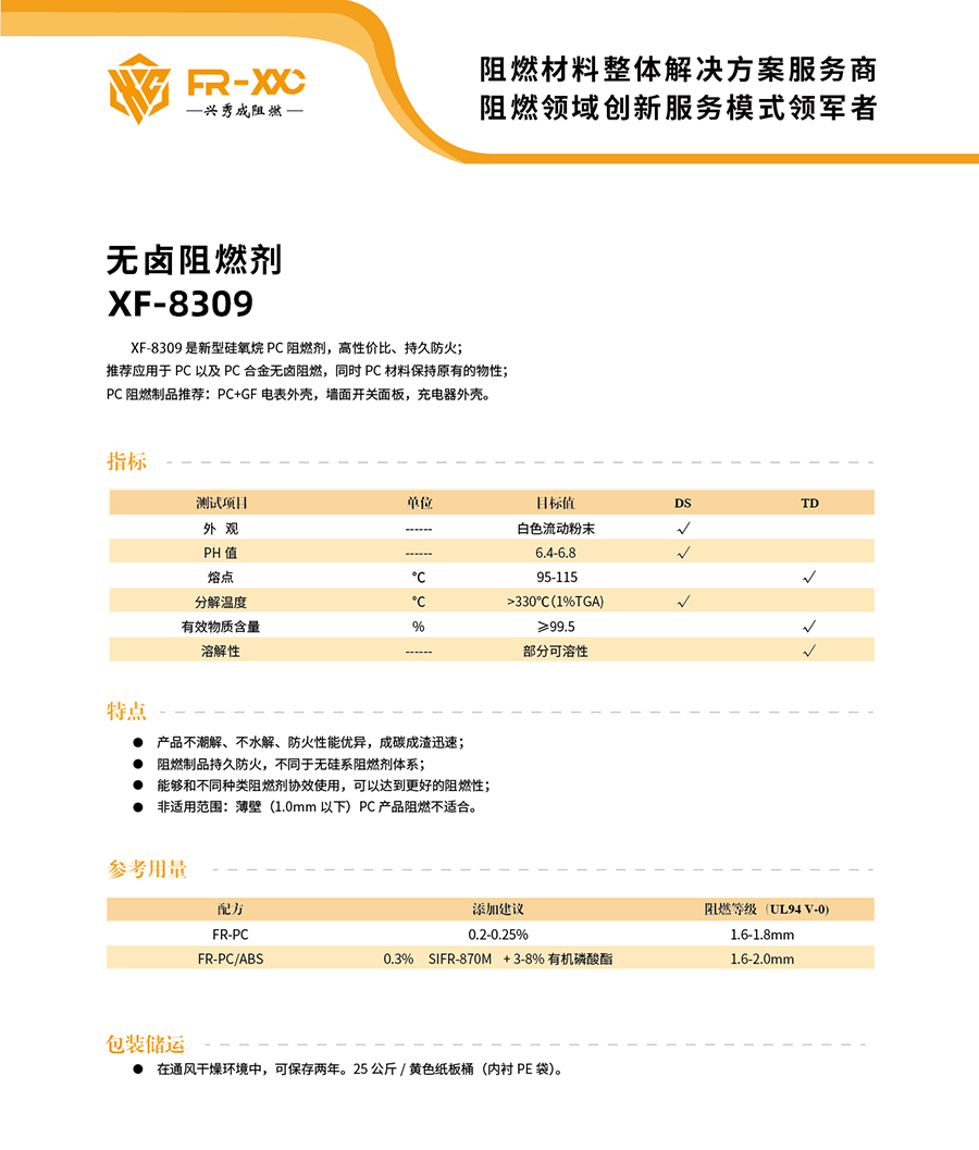 XF-8309是新型硅氧烷PC阻燃剂,高性价比、持久防火; 推荐应用于PC 以及PC合金无卤阻燃,同时PC材料保持原有的物性; PC阻燃制品推荐:PC+GF 电表外壳,墙面开关面板,充电器外壳。