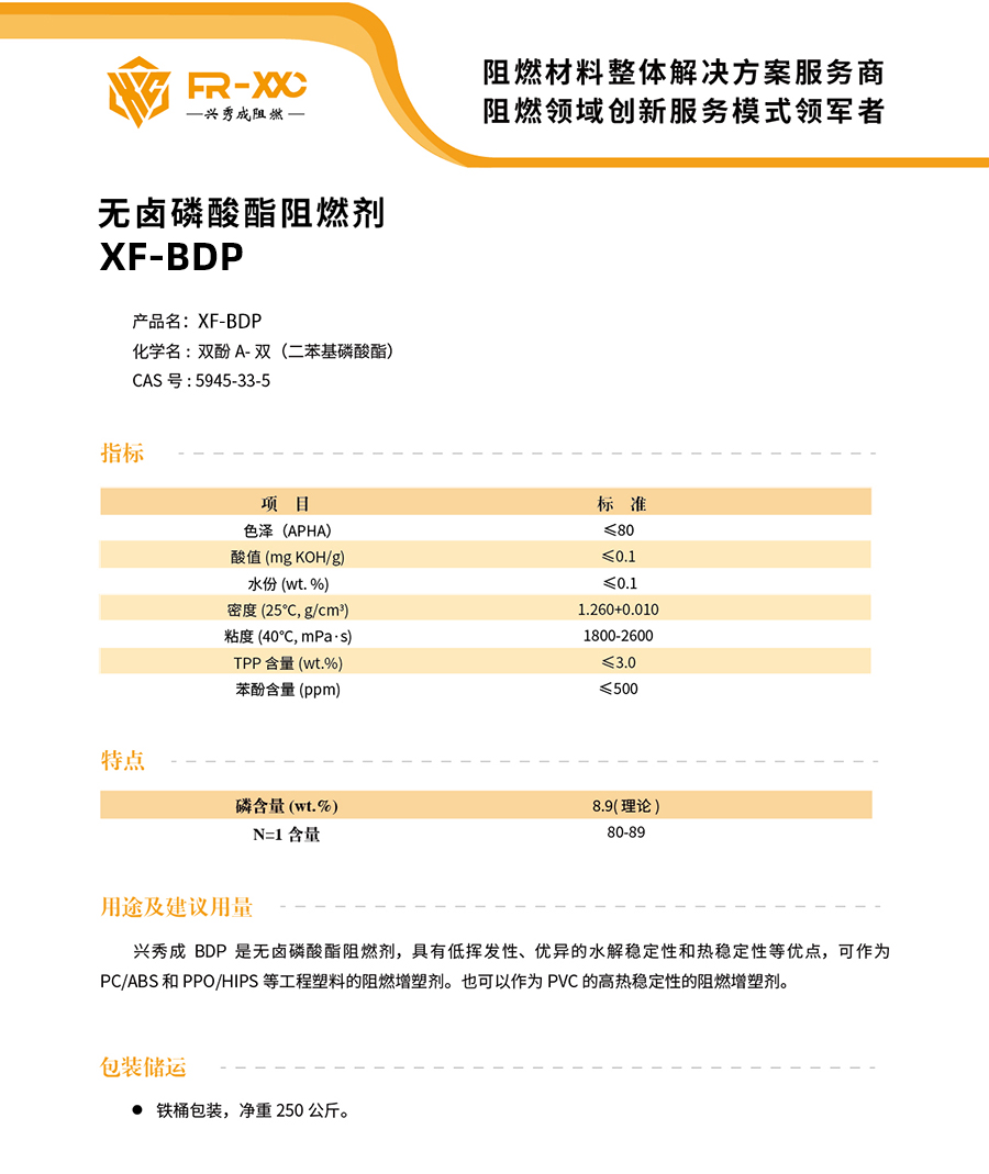 兴秀成 BDP 是无卤磷酸酯阻燃剂,具有低挥发性、优异的水解稳定性和热稳定性等优点,可作为 PC/ABS和 PPO/HIPS等工程塑料的阻燃增塑剂。也可以作为PVC的高热稳定性的阻燃增塑剂。