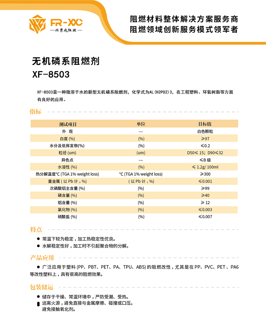 XF-8503是一种微溶于水的新型无机磷系阻燃剂,化学式为AL(H2P02)3,在工程塑料、环氧树脂等方面有良好的应用。