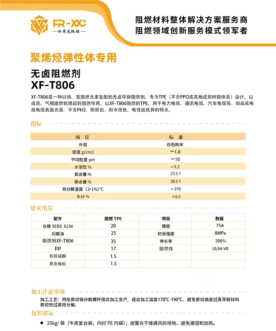 XF-T806是一种以磷、氮阻燃元素复配的无卤环保阻燃剂,专为TPE(不含PPO或其他成炭树脂体系)设计,以成炭、气相阻燃机理起到阻燃作用。以XF-T806阻燃的TPE,用于电力电缆、通讯电缆、汽车电缆等。制品或电线电缆表面光滑、不含PH3、耐析出、耐水性优、电性能优异的特点。