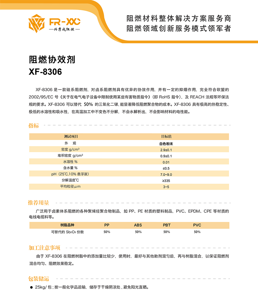 XF-8306 是一款硅系阻燃剂,对卤系阻燃剂具有优异的协效作用,并有一定的抑烟作用,完全符合欧盟的2002/95/EC号《关于在电气电子设备中限制使用某些有害物质指令》(即RoHS 指令),及REACH法规等环保法 规的要求。XF-8306可以替代50%的三氧化二锑,能显著降低阻燃聚合物的成本。XF-8306具有极高的热稳定性、 极低的水溶性和吸水性,在高温加工中不变色不分解,不会水解析出,不会影响材料的电性能。