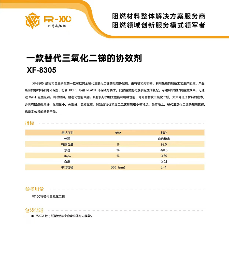 XF-8305 是我司自主研发的一款可以完全替代三氧化二锑的阻燃协效剂,由有机和无机物,利用先进的制备工艺生产而成,产品所有的原材料都属环保型,符合ROHS 环和REACH环保法令要求,此款阻燃剂与溴系阻燃剂复配,可达到非常好的阻燃效果,可通过VW-1 阻燃级别。同时耐热,耐老化性能卓越,具有良好的加工性能和机械性能,可完全替代三氧化二锑,大大降低了材料的成本,