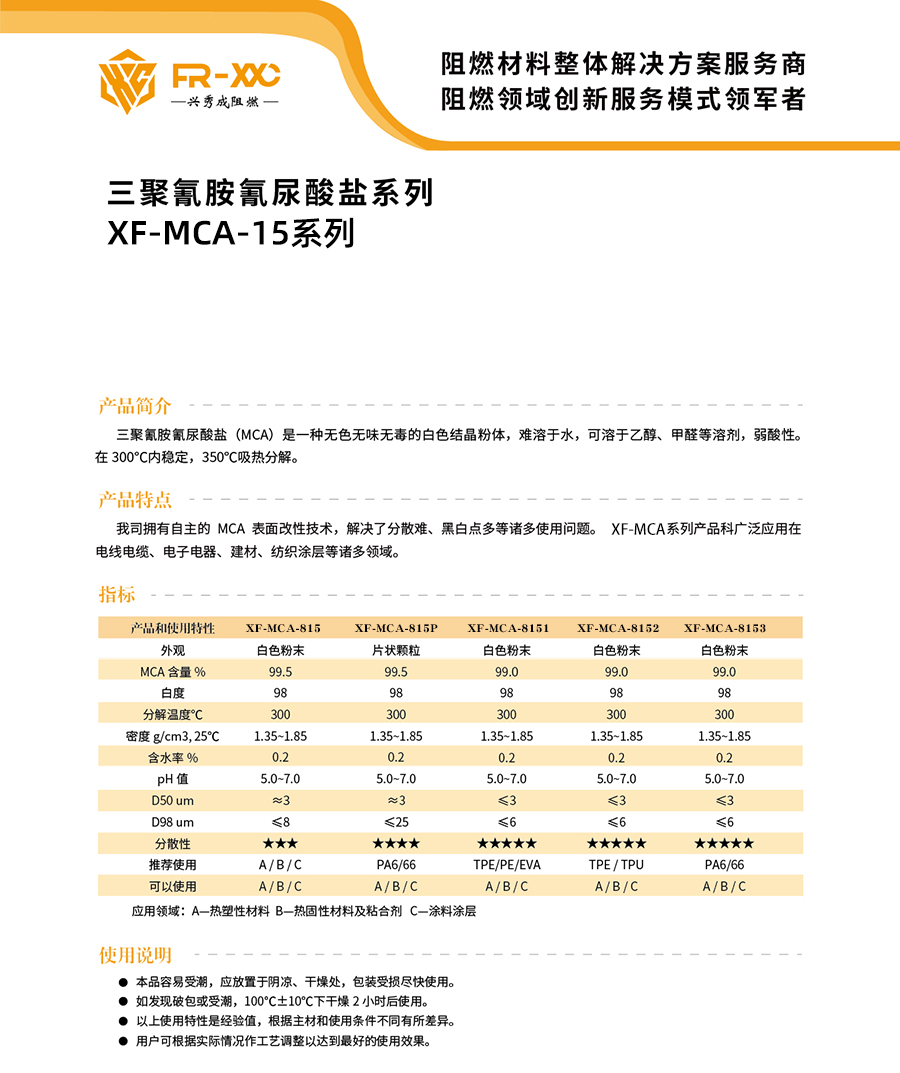 三聚氰胺氰尿酸盐(MCA)是一种无色无味无毒的白色结晶粉体,难溶于水,可溶于乙醇、甲醛等溶剂,弱酸性。在300°C内稳定,350℃吸热分解。