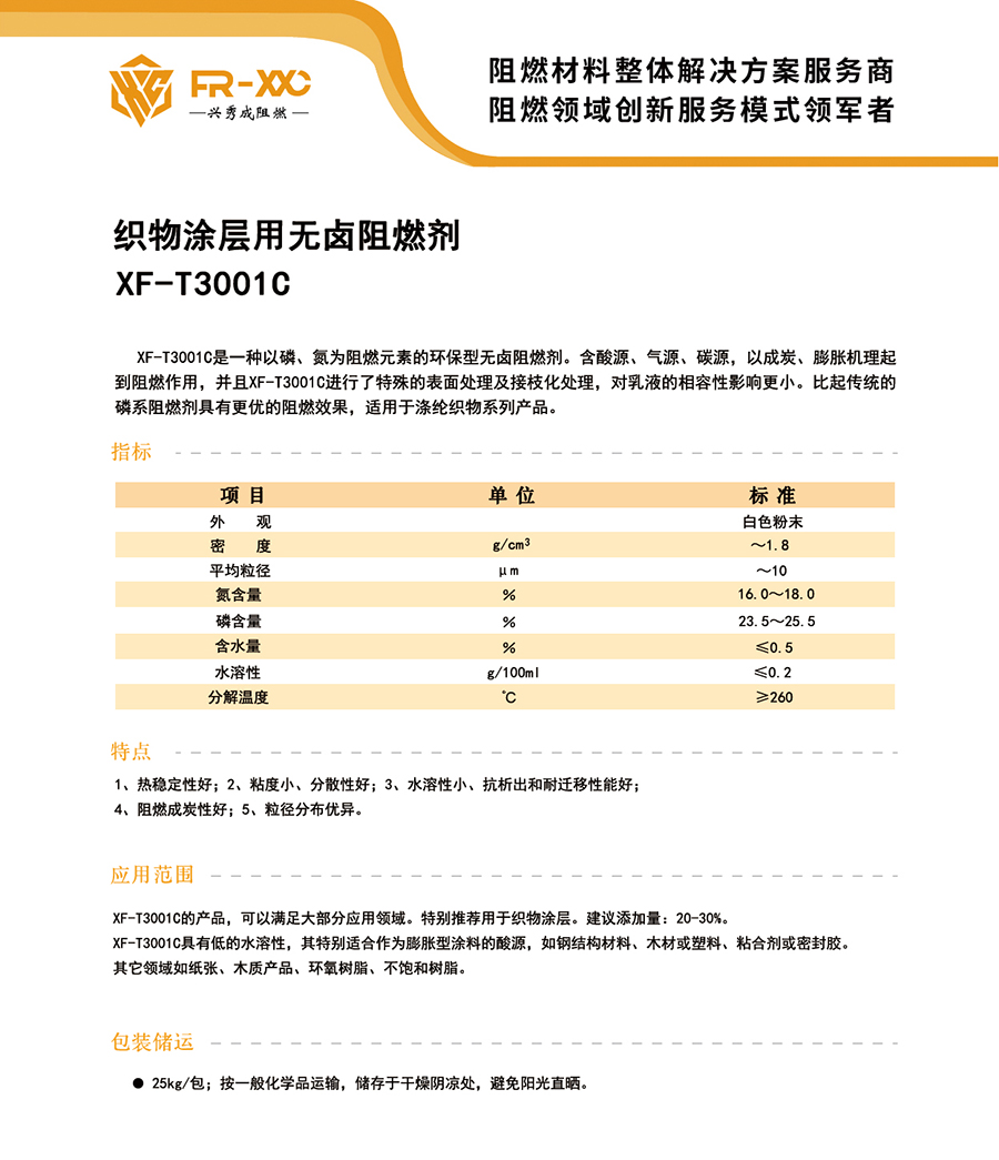 XF-T3001C是一种以磷、氮为阻燃元素的环保型无卤阻燃剂。含酸源、气源、碳源,以成炭、膨胀机理起到阻燃作用,并且XF-T3001C进行了特殊的表面处理及接枝化处理,对乳液的相容性影响更小。比起传统的磷系阻燃剂具有更优的阻燃效果,适用于涤纶织物系列产品。