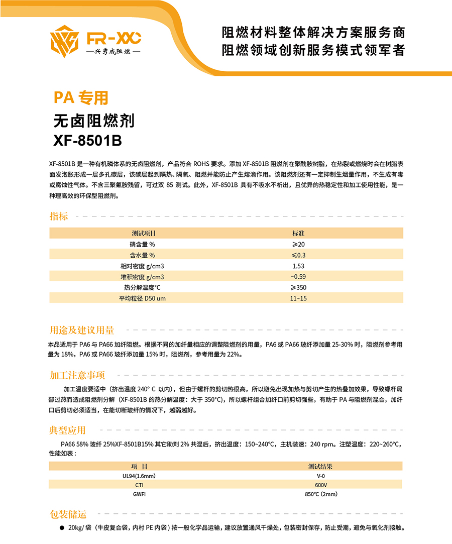 XF-8501B 是一种磷、氮复合无卤阻燃剂,产品符 合 ROHS 要求。添加 XF-8501B 阻燃剂在聚酰胺树脂在 热裂或燃烧时会在树脂表面发泡膨胀形成一层多孔碳层, 该碳层起到隔热、隔氧、阻燃并能防止产生熔滴作用。该阻 燃剂还有一定抑制生烟量作用,不生成有毒或腐蚀性气 体。此外,XF-8501B 具有不吸水不析出,没有三聚氰胺残 留,颜色稳定,且优异的热稳定性和加工使用性能,是一种 理想的高效的环保型阻燃剂。