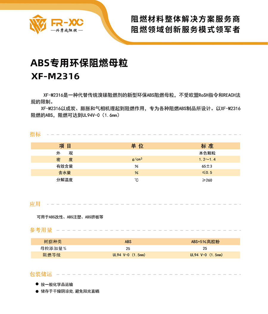 XF-M2316是一种代替传统溴锑阻燃剂的新型环保ABS阻燃母粒,不受欧盟RoSH指令和REACH法规的限制。 XF-M2316以成炭、膨胀和气相机理起到阻燃作用,专为各种阻燃ABS制品所设计。以XF-M2316阻燃的ABS,阻燃可达到UL94V-0(1.6mm)